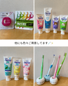 お子様用の歯磨き粉、歯ブラシ、仕上げ磨き用の歯ブラシもご用意しております。